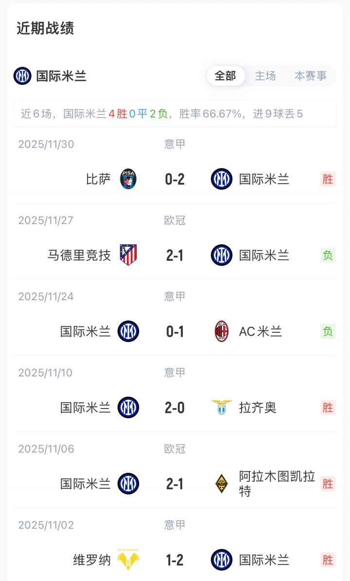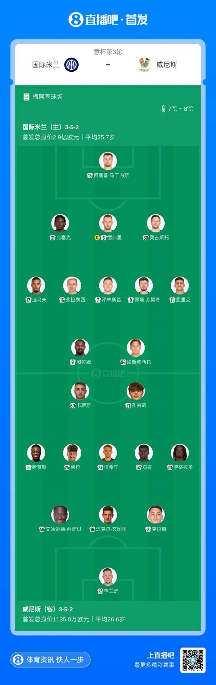 12月4日讯 意杯第3轮,国际米兰主场迎战威尼斯,赛前双方首发公布。